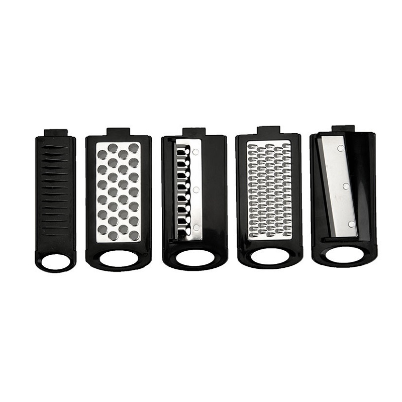 Plástico negro y cuchillas de acero inox. Apta para lavavajillas. Incluye 5 cuchillas.
