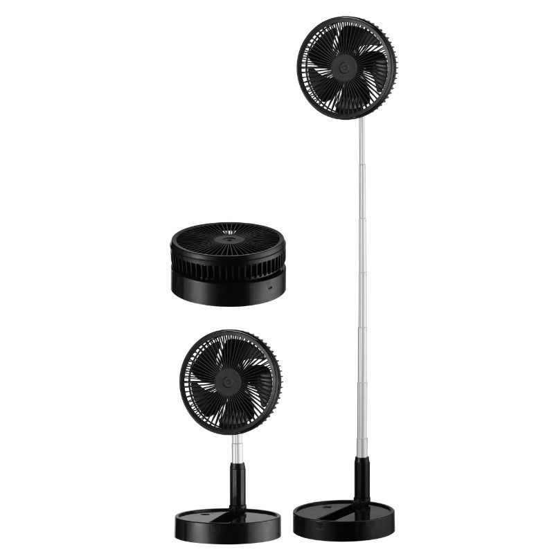 Ventilador DC Portátil de la serie GALAN con cinco aspas en color NEGRO. Con batería de litio 7200mAh recargable a puerto USB, apto para funcionar sin cables cuando está cargado, lo que lo hace ideal para campings , cocinas , patios, terrazas, etc. Es EXTENSIBLE , gracias a su cuerpo telescópico puede actuar tanto como ventilador de pie como de sobremesa, muy útil para mesas de estudio o trabajo. Realizado en metal y ABS, materiales fuertes y resistentes. Motor DC con tres velocidades. Su tamaño lo hace fácil de transportar y guardar, se queda cerrado por completo con una altura de apenas 20 centímetros. Tiene unas dimensiones, abierto para funcionar, con altura regulable de 48<102,5x20x20 centímetros. Viene también con MANDO A DISTANCIA y TEMPORIZADOR de 1 a 4 horas.